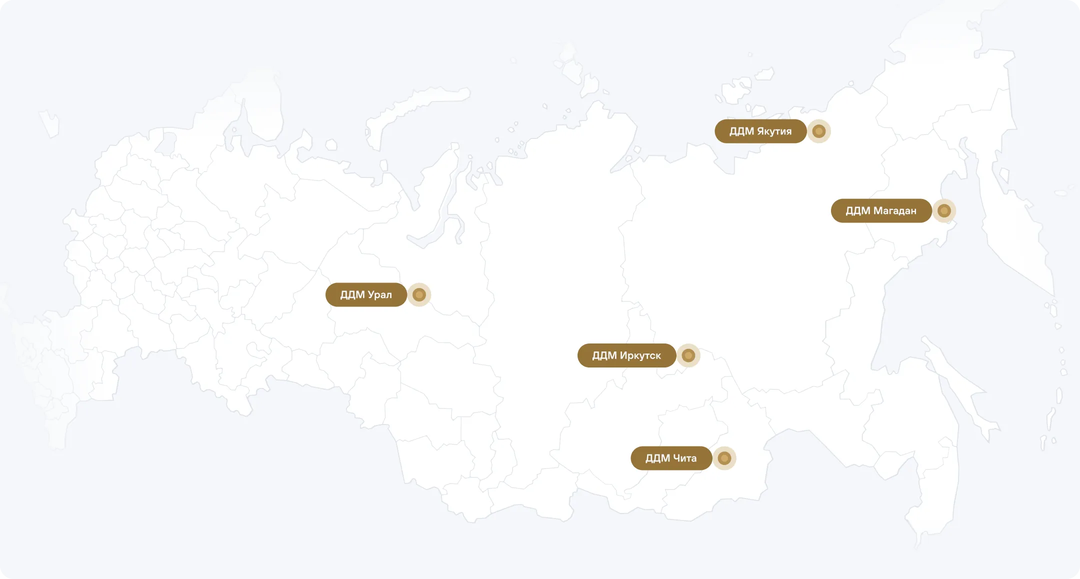 Основные предприятия расположены в богатейших золотодобывающих регионах России: Пермском крае, Свердловской, Иркутской, Магаданской областях, Забайкальском крае, а также в Республике Саха (Якутия).